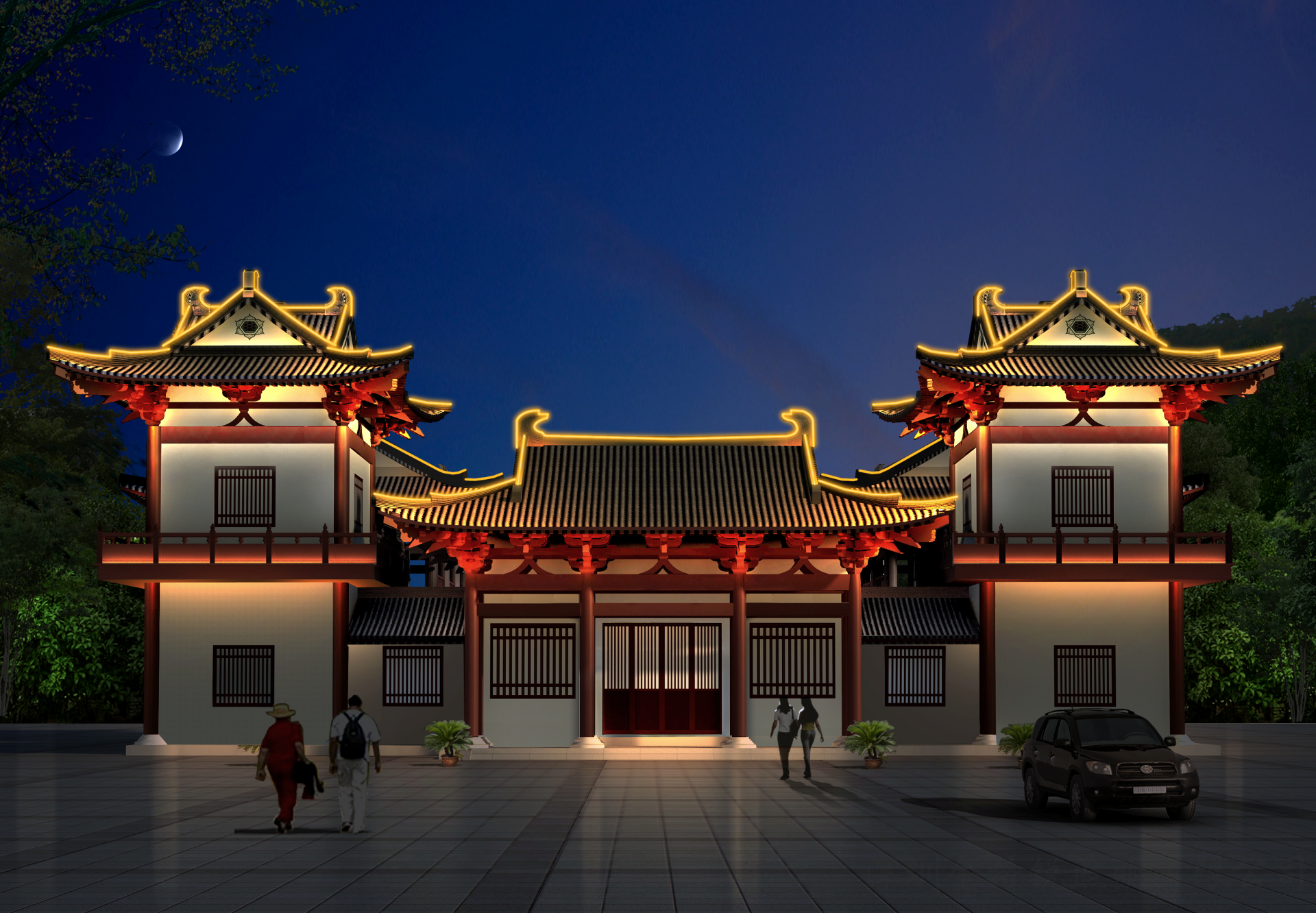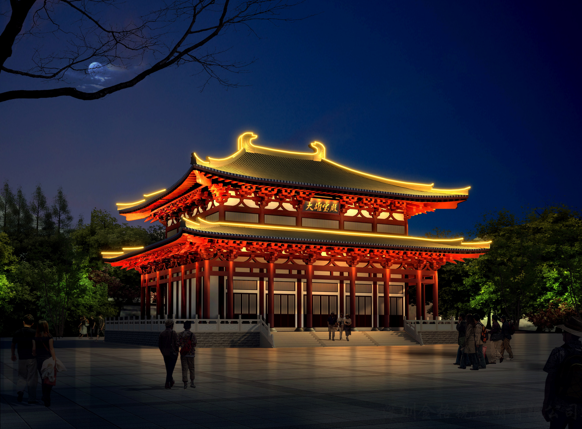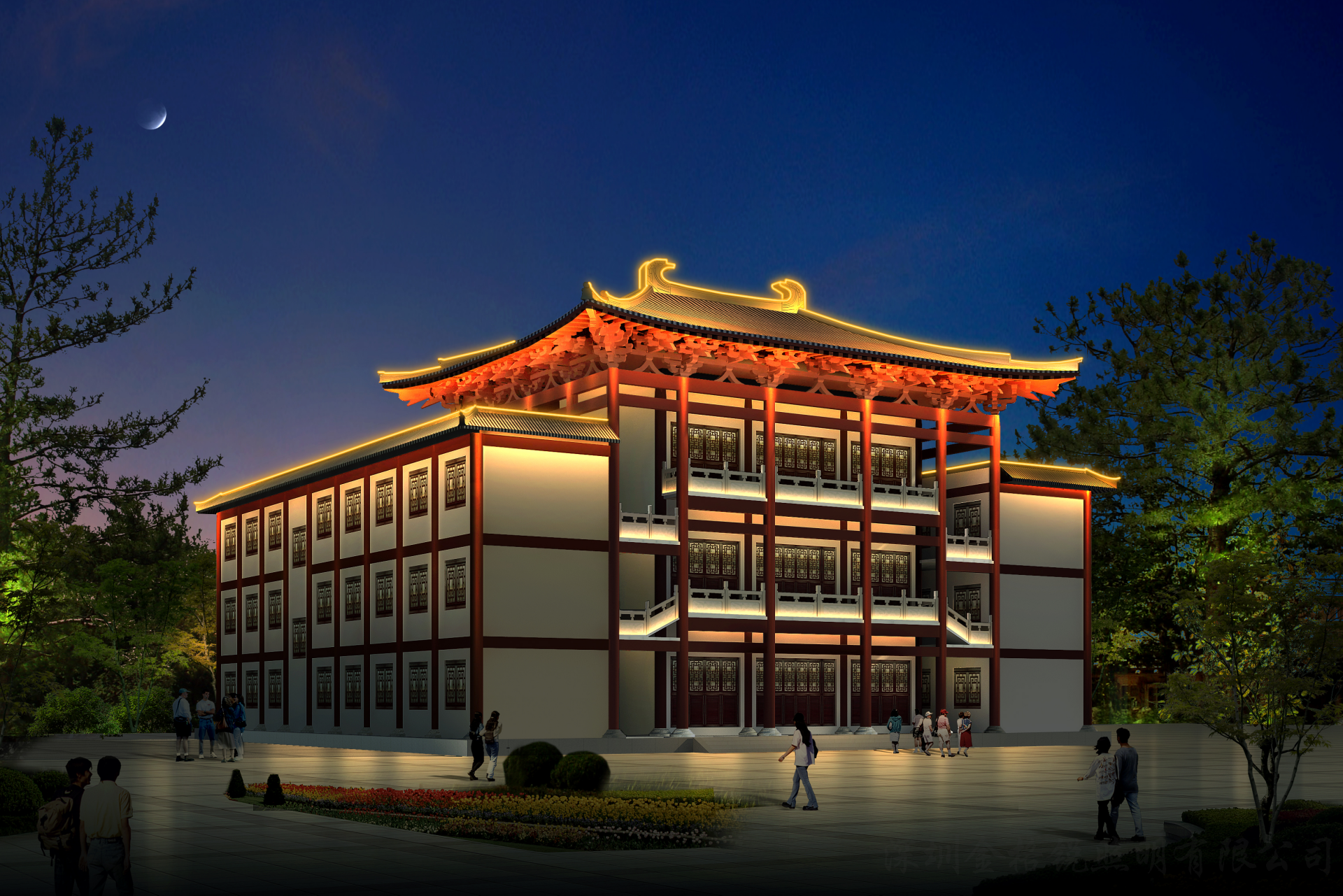 | 夜景簡介 | 麻涌華陽湖拈花寺采用了傳統(tǒng)的古建照明手法,襯托出寺廟的莊嚴(yán),神秘感。 |