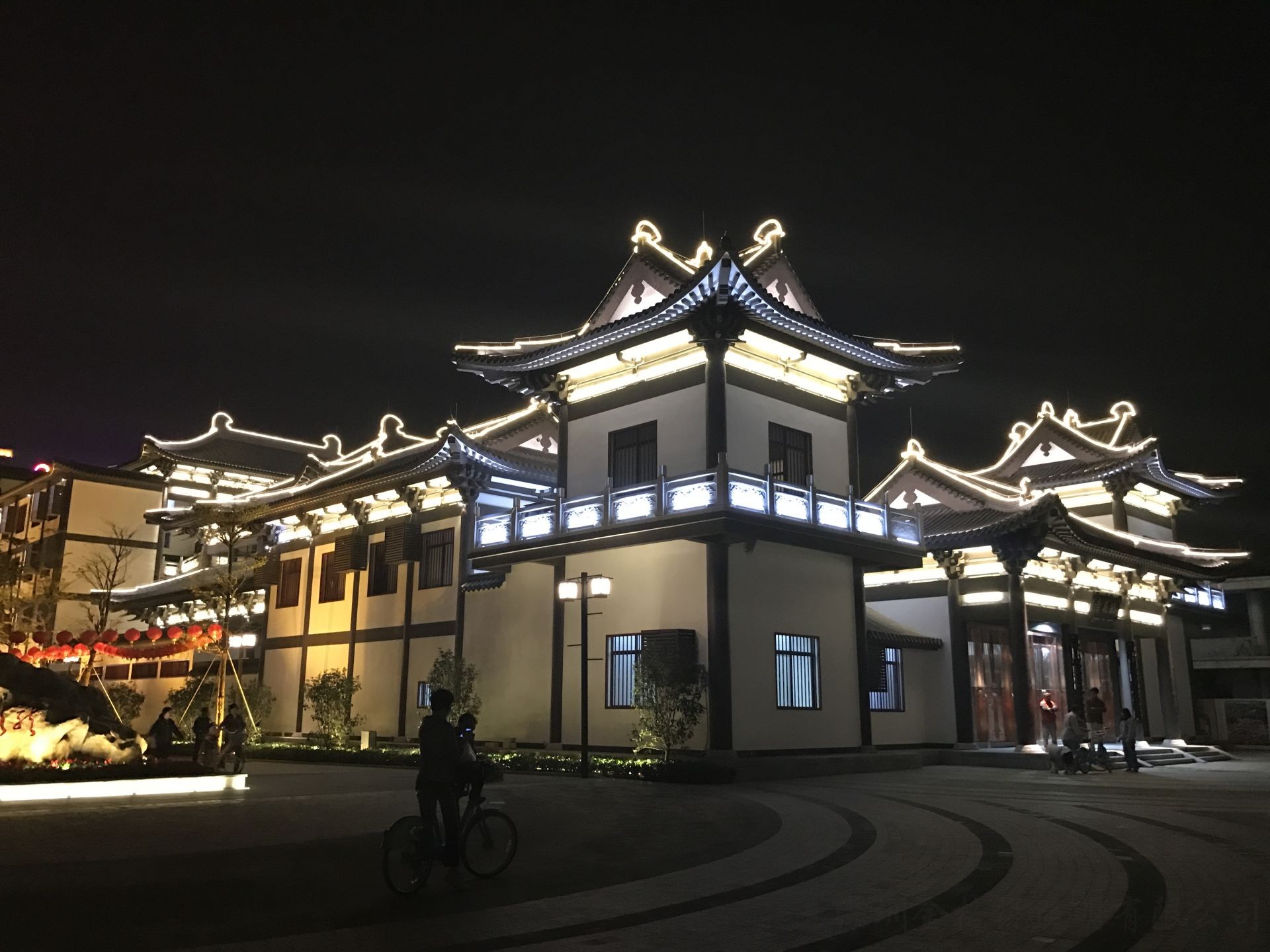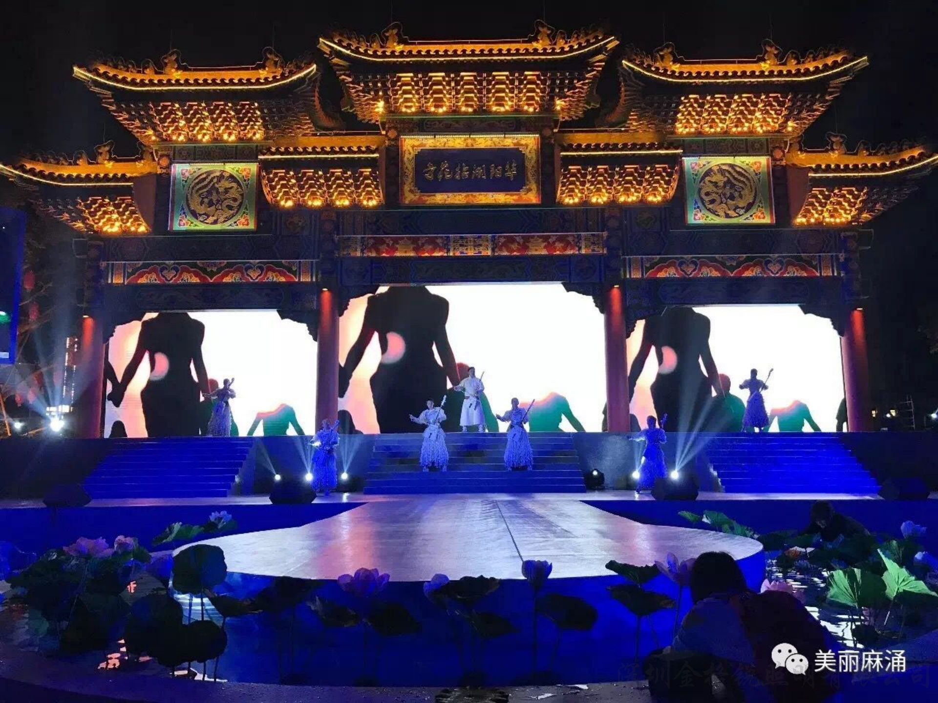 | 夜景簡介 | 麻涌華陽湖拈花寺牌坊配合節(jié)假日 舞臺演繹效果,融合了舞臺背景、 舞臺燈光演職人員的立體實(shí)景效果。 |